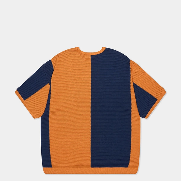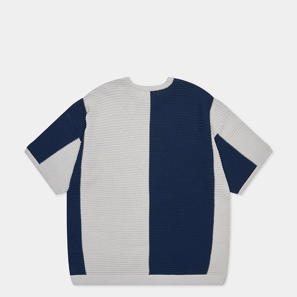 - 세로 스트라이프 패턴과 가로 파이핑 조직으로 짜여진 니트 반팔