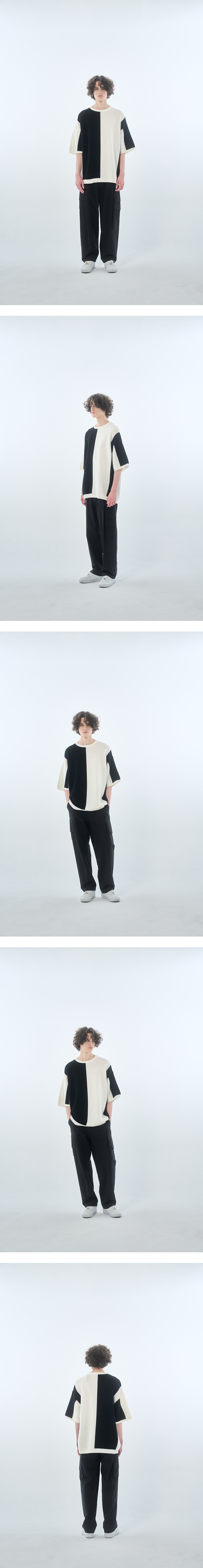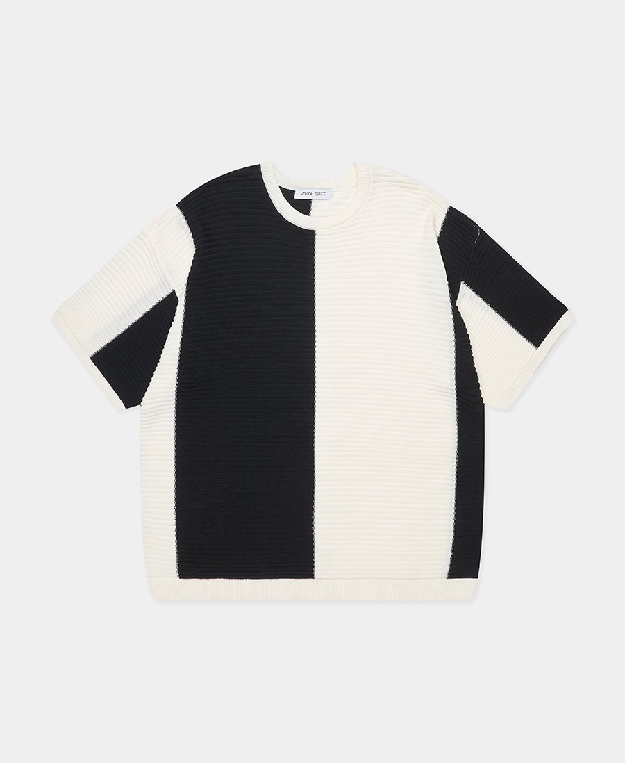 - 세로 스트라이프 패턴과 가로 파이핑 조직으로 짜여진 니트 반팔
