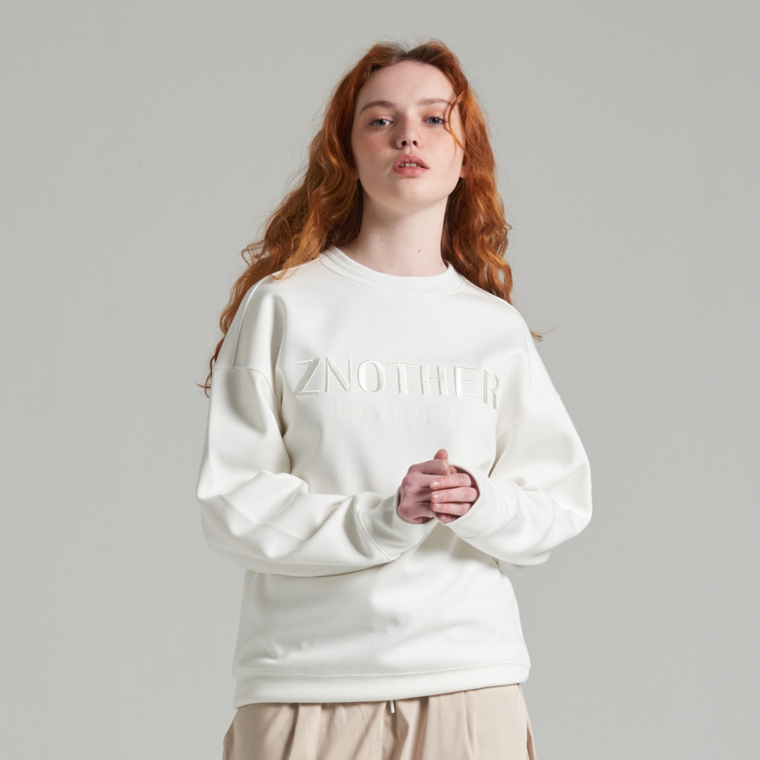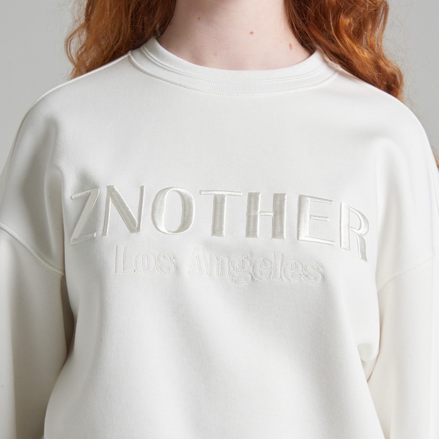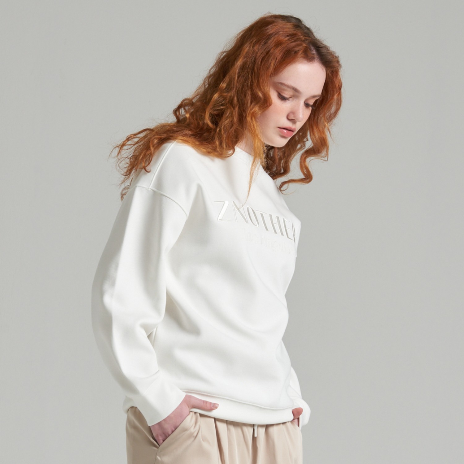 ZNOTHER 시그니처 레터링 자수가 있는 남녀 누구나 데일리하게 착용 가능한 세미 오버핏 스웨트셔츠 입니다.