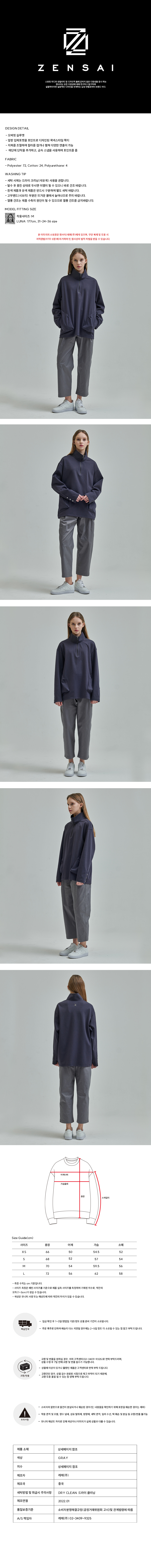 앞판 입체포켓을 포인트로 디자인된 목넥스타일 쭉티입니다. 지퍼를 조절하여 칼라를 접거나 펼쳐 다양한 연출이 가능합니다. 소매단에 단작을 추가하고, 금속 스냅을 사용하여 포인트를 주었습니다.